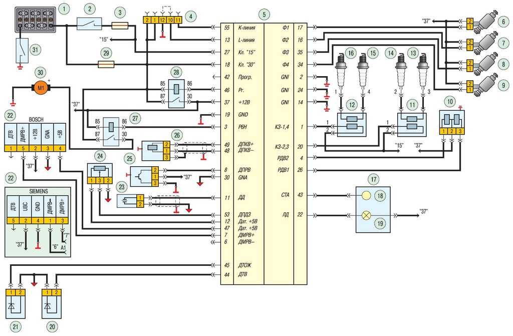 Вторая – немного более сложная (учитывается подключение блока управления карбюратором). Такая схема должна применяться, если необходимо подключение к работе всех электронных систем автомобиля, а не только зажигания и необходимого для управления автотранспортным средством минимума.