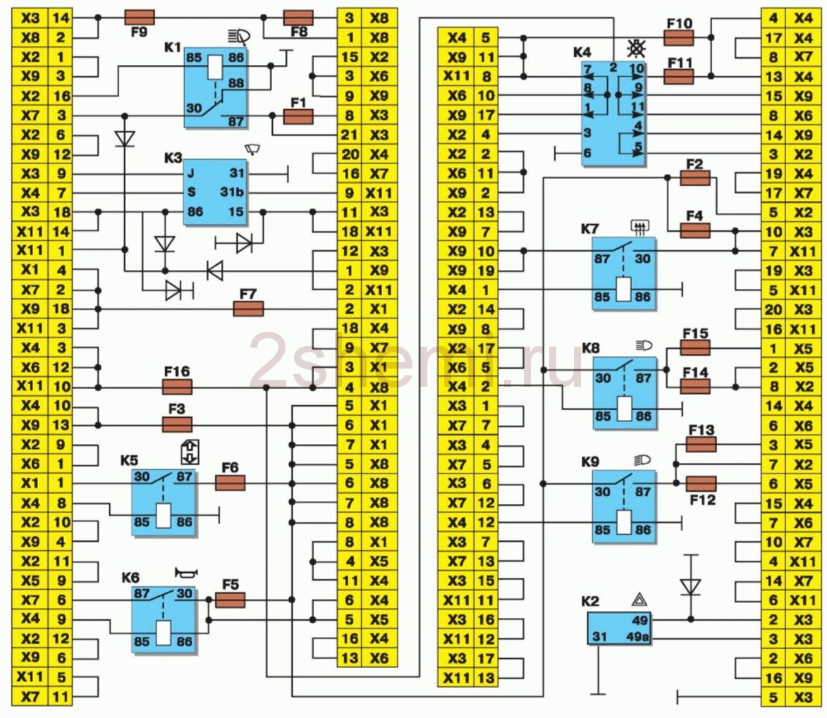 K1-реле включения очистителей фар; K2-реле-прерыватель указателей поворота и аварийной сигнализации; K3-реле стеклоочистителя ветрового окна; K4-реле контроля исправности ламп; K5-реле включения стеклоподъемников; K6 — реле включения звуковых сигналов; K7-реле включения электрообогрева заднего стекла; K8-реле включения дальнего света фар; K9-реле включения ближнего света фар; F1-F16 — плавкие предохранители.