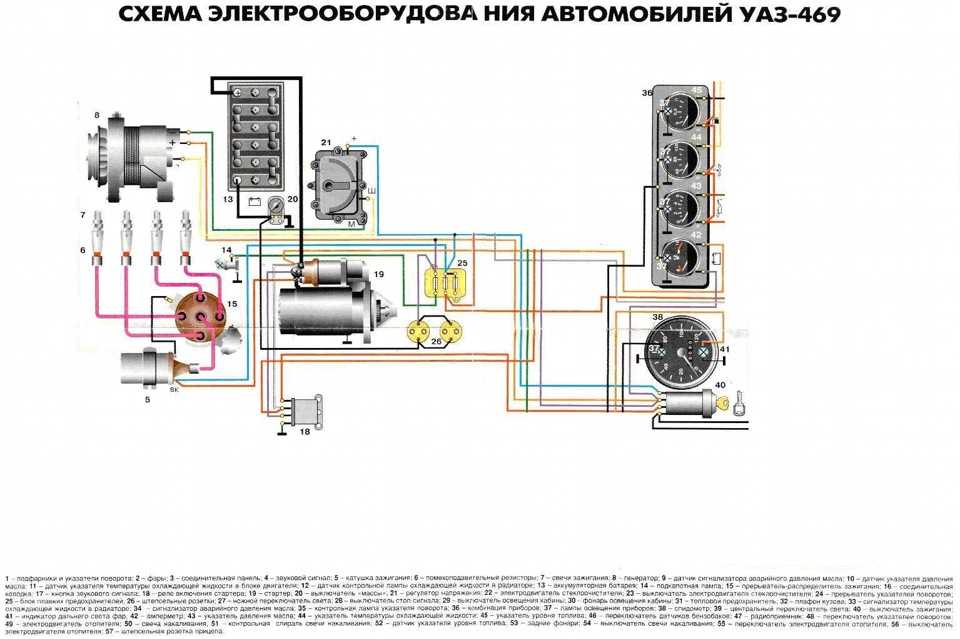 На электросхеме УАЗ 469, в зависимости от версии автомобиля, может быть разное количество проводов. Для удобства работы с электропроводкой, проводы часто бывают окрашены разными цветами.
