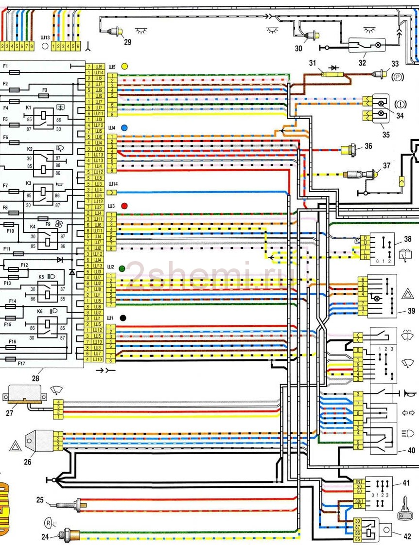 P1 — реле включения обогрева заднего стекла; P2 — реле включения очистителей и омывателей фар; PЗ — реле включения звуковых сигналов; P4 — реле включения электродвигателя вентилятора системы охлаждения двигателя; P5 — реле включения дальнего света фар; P6 — реле включения ближнего света фар; А — порядок условной нумерации штекеров в колодках монтажного блока. Наружная цифра с буквой «Ш» в обозначении штекера — номер колодки, а внутренняя цифра — условный номер штекера. Штекеры колодок без цветной маркировки условно показаны коричневым цветом