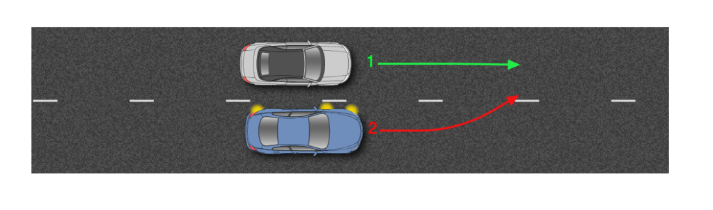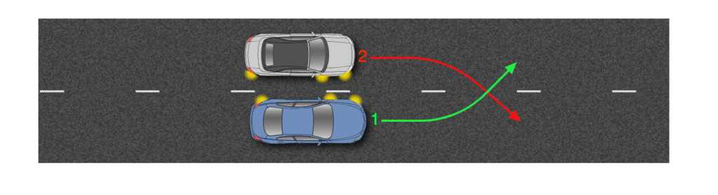 Бывает, складывается иная ситуация: две машины, движущиеся в одном и том же ряду, перестраиваются в другой ряд — одинаковый для обеих машин.