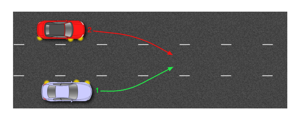 - Одновременное перестроение в одну полосу: выполняется когда оба автомобиля перестраиваются из разных полос в одну (среднюю) полосу.