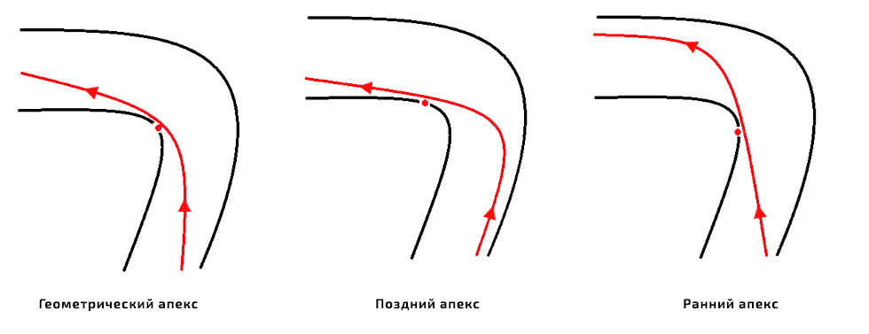 Говоря обо всех трех видах апекса, стоит понимать, что для каждого конкретного поворота идеальный апекс может отличаться от всех трех типов, тяготея к какому-то из них: ведь при прохождении поворота могут стоять разные задачи – например, пройти его максимально быстро или максимально срезать траекторию.