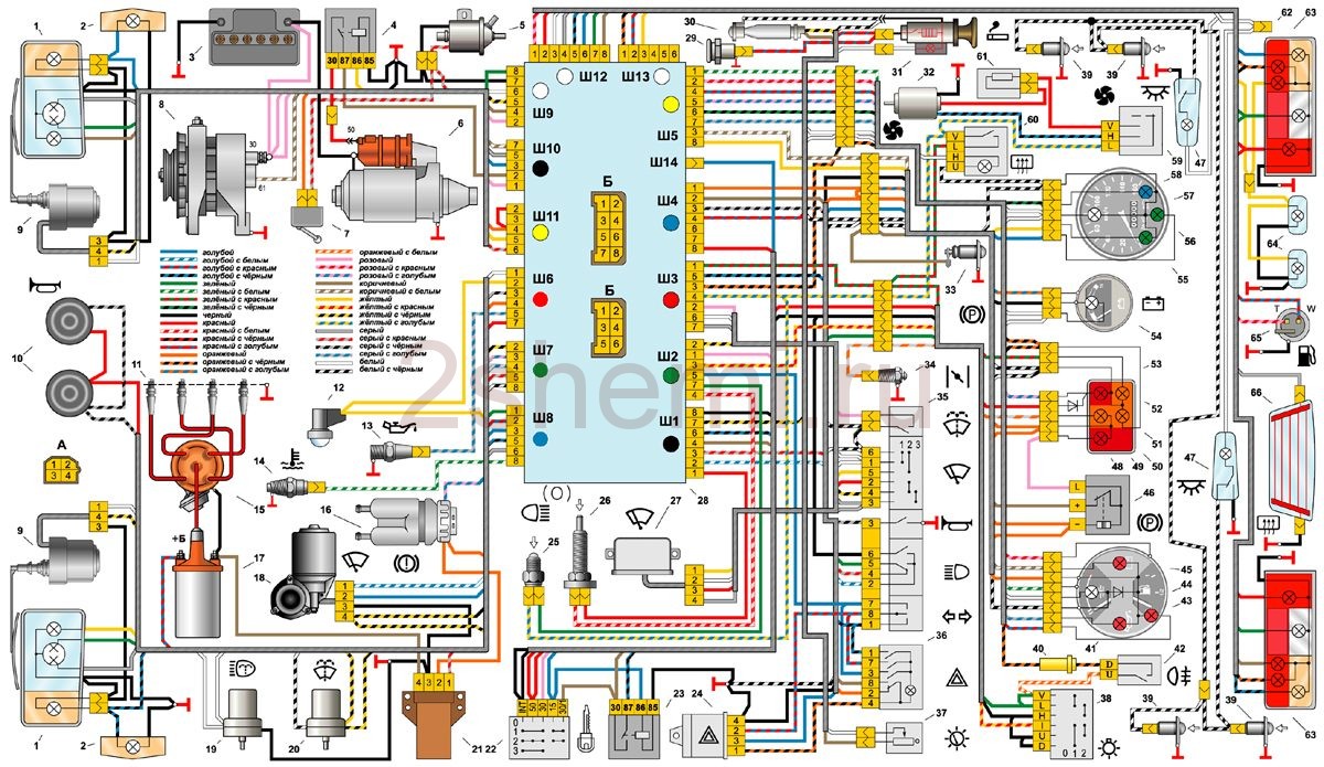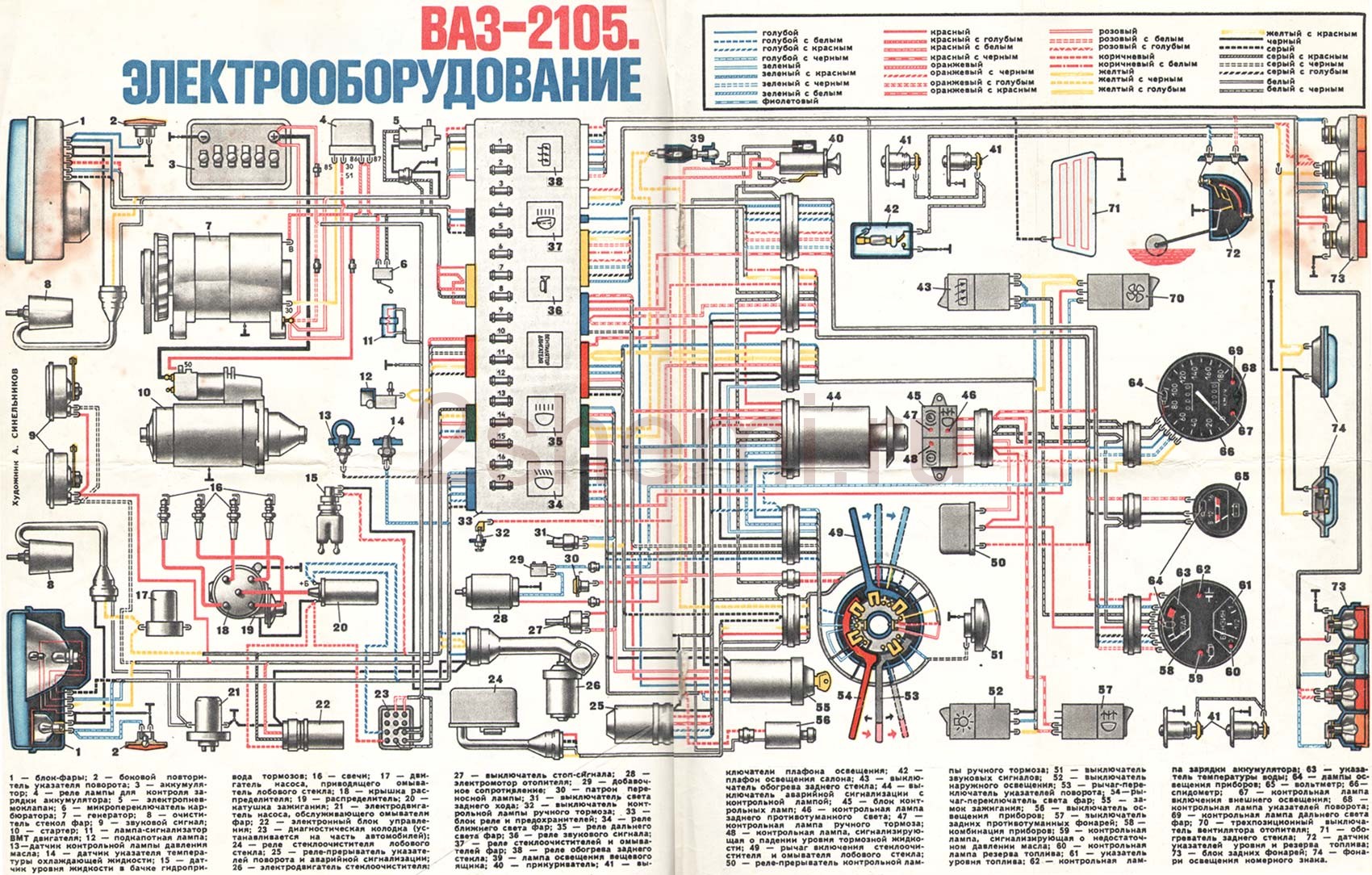 Это цветная схема электрооборудования VAZ 2105. В верхней части изображения справа указаны цвета проводов, снизу — обозначения элементов.