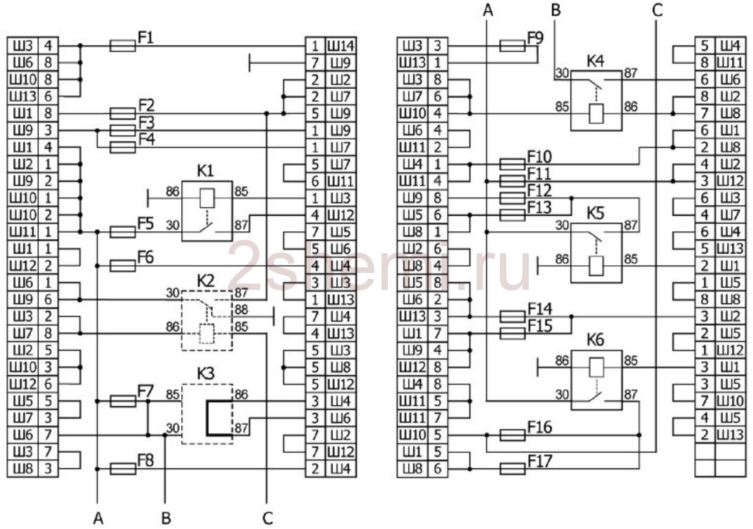 К1 Реле включения обогрева заднего стекла К2 Реле включения очистителей омывателей фар К3 Реле включения звукового сигнала (перемычка) К4 Реле включения электродвигателя вентилятора К5 Реле включения дальнего света фар К6 Реле включения ближнего света фар