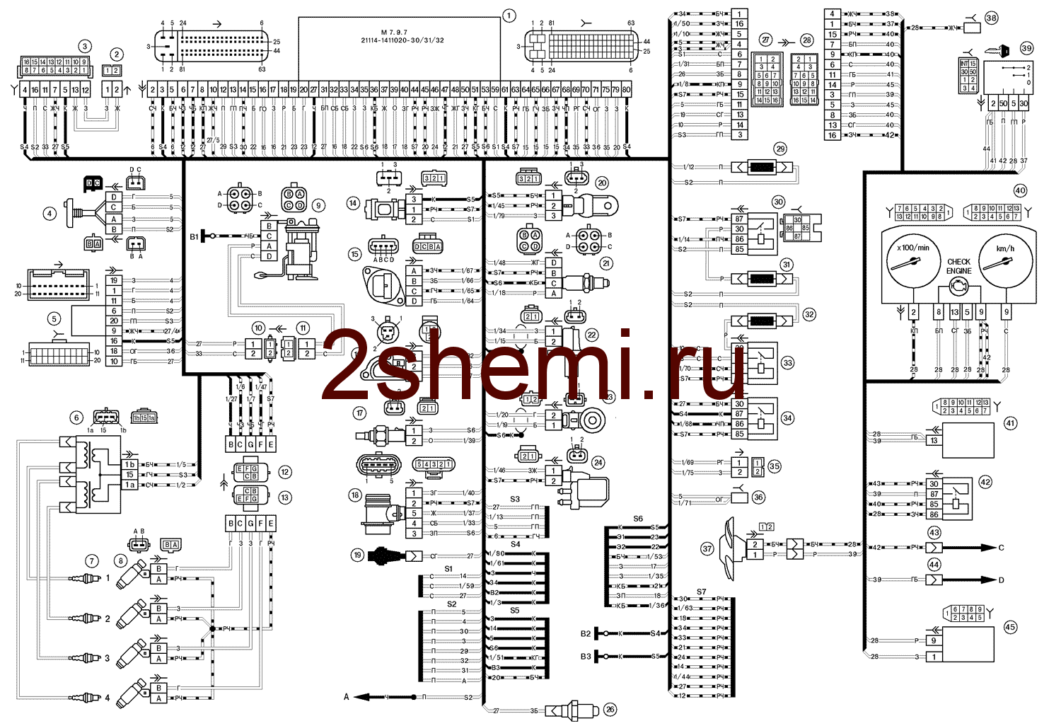 1 – контроллер ВАЗ-21101; 2 – колодка жгута системы зажигания к жгуту салонной группы АБС ; 3 – колодка диагностики; 4 – датчик сигнализатор иммобилизатора; 5 – блок управления иммобилизатора; 6 – катушка зажигания; 7 – свечи зажигания; 8 – форсунки; 9 – электробензонасос; 10 – колодка жгута системы зажигания к жгуту датчика уровня топлива; 11 – колодка жгута датчика уровня топлива к жгуту системы зажигания; 12 – колодка жгута системы зажигания к жгуту форсунок; 13 – колодка жгута форсунок к жгуту системы зажигания; 14 – датчик скорости; 15 – регулятор холостого хода; 16 – датчик положения дроссельной заслонки; 17 – датчик температуры охлаждающей жидкости; 18 – датчик массового расхода воздуха; 19 – датчик контрольной лампы давления масла; 20 – датчик фаз; 21 – датчик кислорода; 22 – датчик положения коленчатого вала; 23 – датчик детонации; 24 – электромагнитный клапан продувки адсорбера; 26 – датчик указателя температуры охлаждающей жидкости; 27 – колодка жгута системы зажигания к жгуту панели приборов; 28 – колодка жгута панели приборов к жгуту системы зажигания; 29 – предохранитель цепи питания контроллера; 30 – реле зажигания; 31 – предохранитель реле зажигания; 32 – предохранитель цепи питания электробензонасоса; 33 – реле электробензонасоса; 34 – реле электровентилятора; 35 – колодка жгута системы зажигания к соединителю кондиционера; 36 – колодка жгута системы зажигания к жгуту боковых дверей. 37 – электровентилятор системы охлаждения; 38 – диагностический разъем; 39 – выключатель зажигания; 40 – комбинация приборов; 41 – блок бортовой системы контроля; 42 – реле стартера; 43 – контакты 8-клеммных колодок жгута панели приборов и жгута переднего; 44 – контакты 21-клеммных колодок жгута панели приборов и жгута заднего; 45 – маршрутный компьютер.