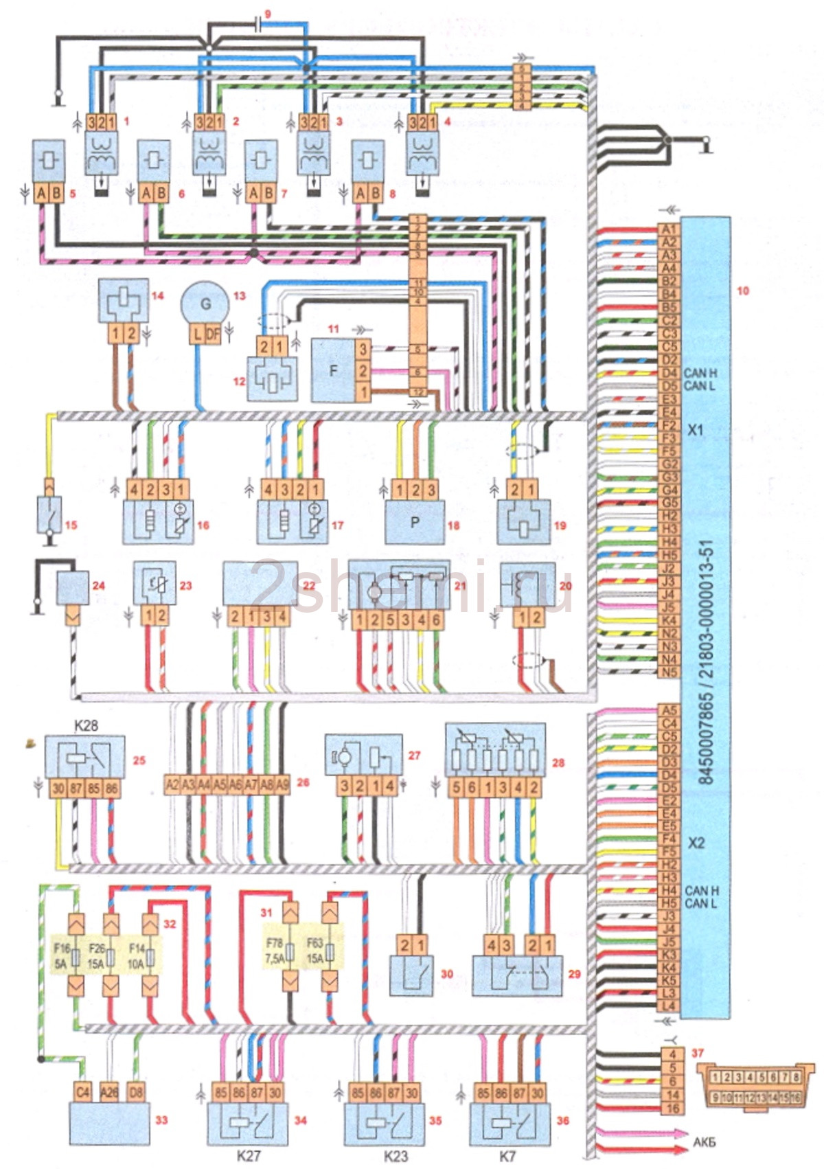 1 – катушка зажигания первого цилиндра; 2 – катушка зажигания второго цилиндра; 3 – катушка зажигания третьего цилиндра; 4 – катушка зажигания четвертого цилиндра; 5 – форсунка первого цилиндра; 6 – форсунка второго цилиндра; 7 – форсунка третьего цилиндра; 8 – форсунка четвертого цилиндра; 9 – конденсатор; 10 – электронный блок управления двигателем; 11 – датчик положения распределительного вала; 12 – датчик детонации (ДД); 13 – генератор; 14 – электромагнитный клапан системы впуска воздуха; 15 – датчик аварийного давления масла; 16 – датчик концентрации кислорода (ДК диагностический); 17 – датчик концентрации кислорода (ДК управляющий); 18 – датчик давления компрессора кондиционера; 19 – клапан продувки адсорбера; 20 – датчик положения коленчатого вала (ДПКВ); 21 – дроссельный узел (ДУ); 22 – датчик массового расхода воздуха (ДМРВ); 23 – датчик температуры охлаждающей жидкости (ДТОЖ); 24 – муфта компрессора кондиционера; 25 – реле муфты компрессора кондиционера (К28); 26 – соединительная колодка; 27 – топливный модуль (бензонасос); 28 – электронная педаль газа; 29 – датчик положения педали тормоза; 30 – датчик положения педали сцепления; 31 – блок предохранителей и реле в моторном отсеке; 32 – монтажный блок в салоне; 33 – блок управления электрооборудованием; 34 – главное реле системы управления двигателем (К27); 35 – реле стартера (К23); 36 – реле топливного насоса (К7); 37 – колодка диагностического разъема.