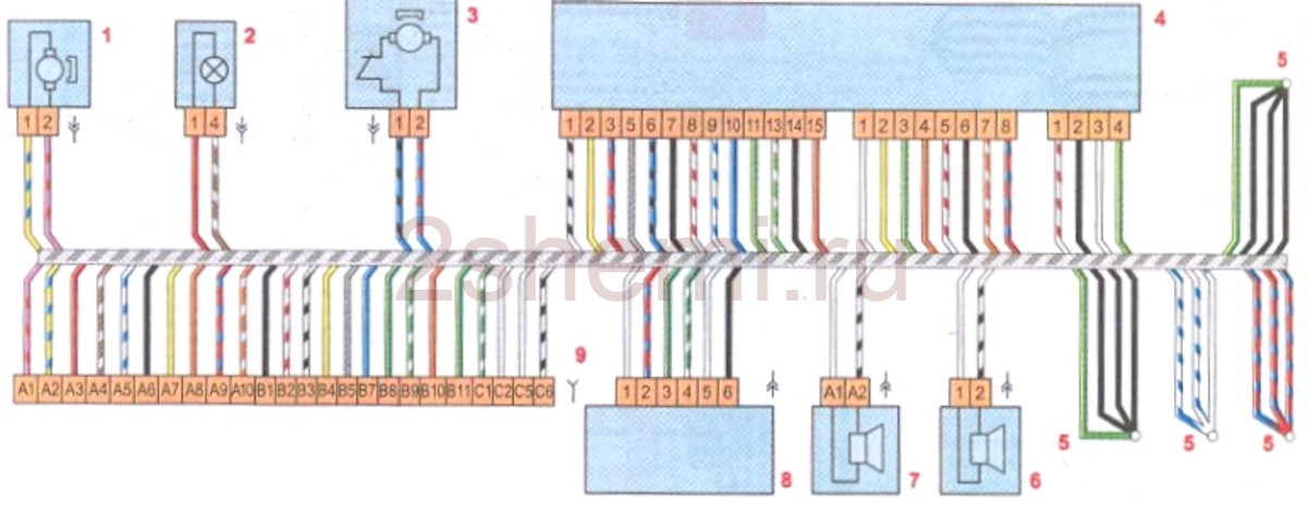 1 – замок двери; 2 – плафон подсветки порога; 3 – мотор-редуктор стеклоподъемника; 4 – блок управления стеклоподъемниками, приводом зеркал и центральным замком; 5 – соединения проводов; 6 – динамик Lada Vesta; 7 – высокочастотный динамик (твитер); 8 – боковое зеркало; 9 – колодка для подключения к колодке заднего жгута проводов.