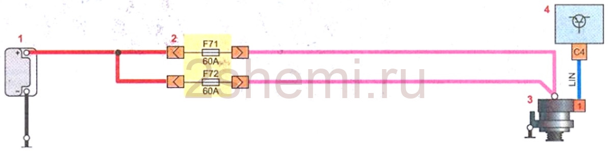 1 – аккумулятор; 2 – монтажный блок в монтажном отсеке; 3 – генератор; 4 – электронный блок управления двигателем.