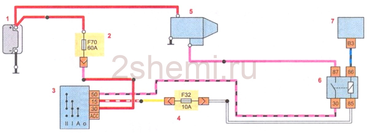 1 – аккумулятор; 2 – монтажный блок в моторном отсеке; 3 – замок зажигания; 4 – блок предохранителей в салоне; 5 – стартер; 6 – реле стартера (К23); 7 – блок управления электрооборудованием.