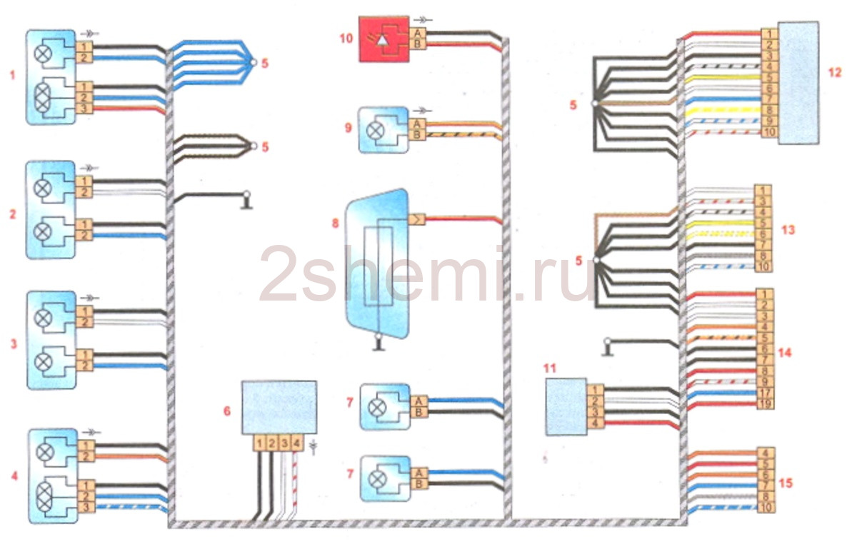 1 – наружная секция заднего левого фонаря; 2 – внутренняя секция заднего левого фонаря; 3 – внутренняя секция заднего правого фонаря; 4 – наружная секция заднего правого фонаря; 5 – соединения проводов; 6 – замок багажника; 7 – плафон освещения номерного знака; 8 – обогрев заднего стекла; 9 – плафон освещения багажника; 10 – дополнительный стоп-сигнал; 11 – камера заднего вида; 12 – блок управления парктроником; 13 – колодка для подключения к жгуту заднего бампера; 14 и 15 – колодка для подключения к заднему жгуту.