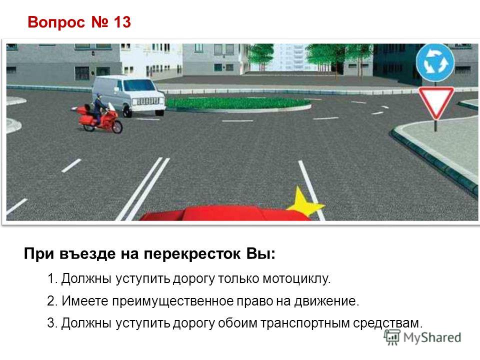 Вопрос 13 При въезде на перекресток Вы: 1. Должны уступить дорогу только мотоциклу. 2. Имеете преимущественное право на движение. 3. Должны уступить дорогу обоим транспортным средствам.