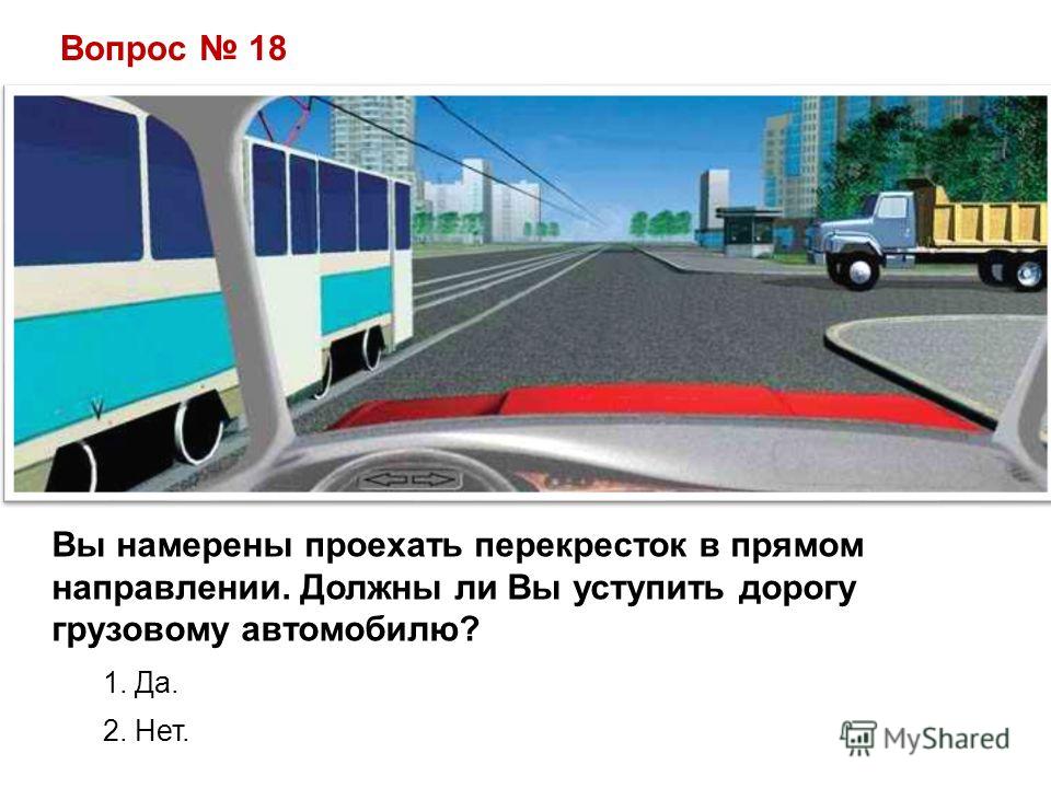 Вопрос 18 Вы намерены проехать перекресток в прямом направлении. Должны ли Вы уступить дорогу грузовому автомобилю? 1. Да. 2. Нет.
