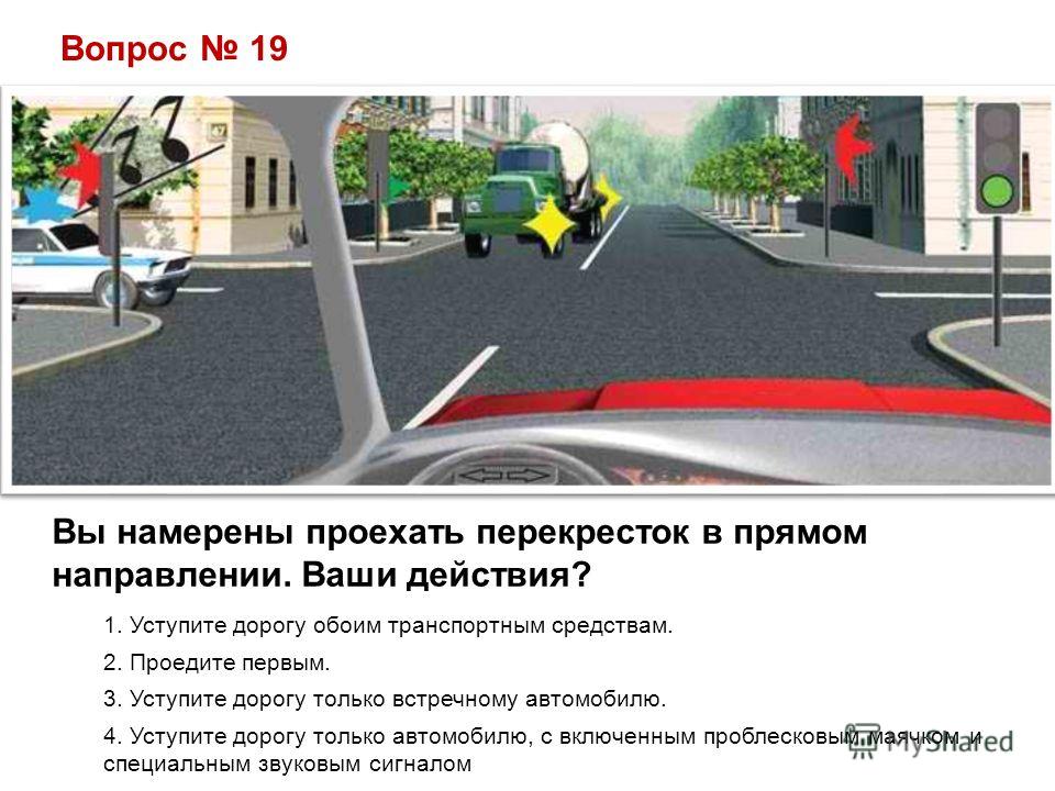 Вопрос 19 Вы намерены проехать перекресток в прямом направлении. Ваши действия? 1. Уступите дорогу обоим транспортным средствам. 2. Проедите первым. 3. Уступите дорогу только встречному автомобилю. 4. Уступите дорогу только автомобилю, с включенным проблесковым маячком и специальным звуковым сигналом