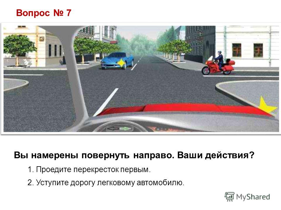 Вопрос 7 Вы намерены повернуть направо. Ваши действия? 1. Проедите перекресток первым. 2. Уступите дорогу легковому автомобилю.