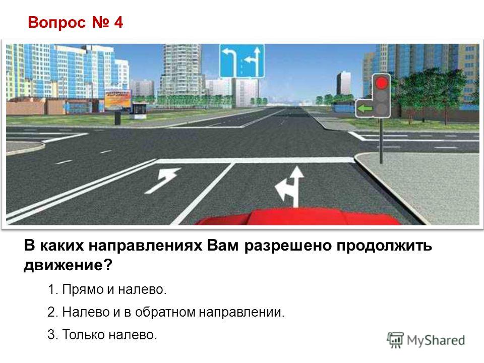 Вопрос 4 В каких направлениях Вам разрешено продолжить движение? 1. Прямо и налево. 2. Налево и в обратном направлении. 3. Только налево.