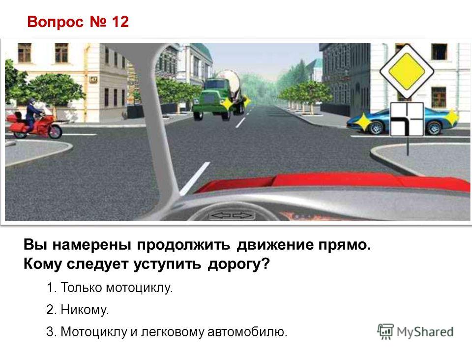 Вопрос 12 Вы намерены продолжить движение прямо. Кому следует уступить дорогу? 1. Только мотоциклу. 2. Никому. 3. Мотоциклу и легковому автомобилю.