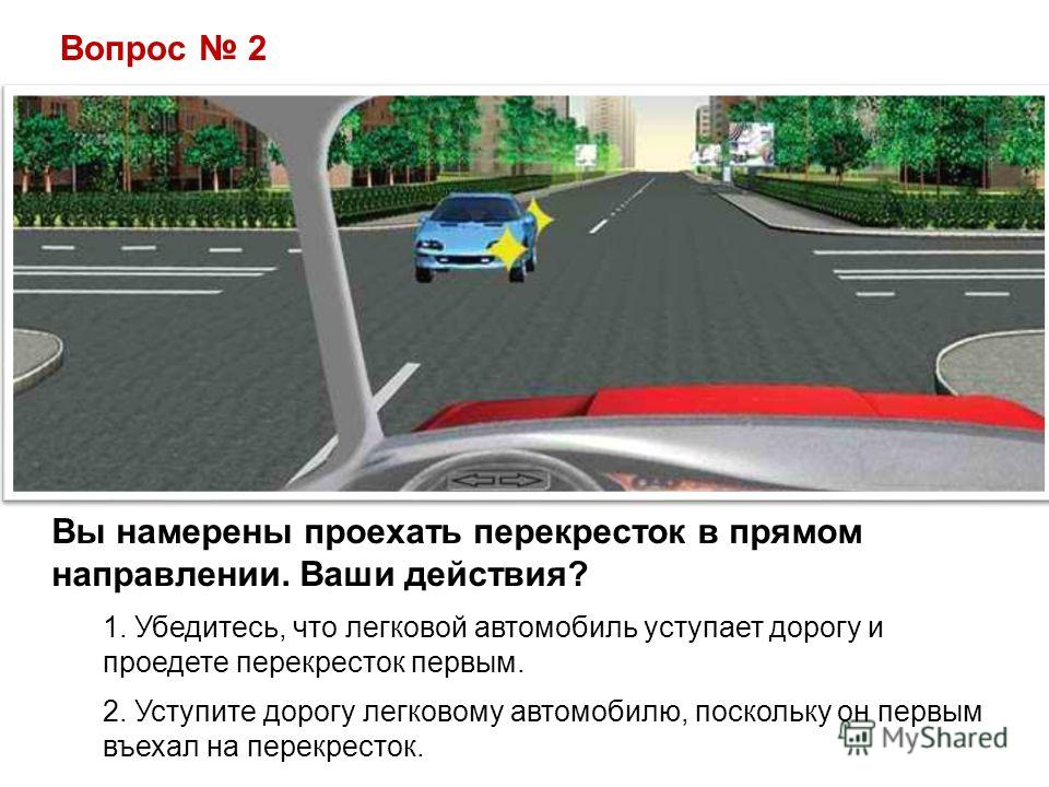 Вы намерены проехать перекресток в прямом направлении. Ваши действия? 1. Убедитесь, что легковой автомобиль уступает дорогу и проедете перекресток первым. 2. Уступите дорогу легковому автомобилю, поскольку он первым въехал на перекресток. Вопрос 2