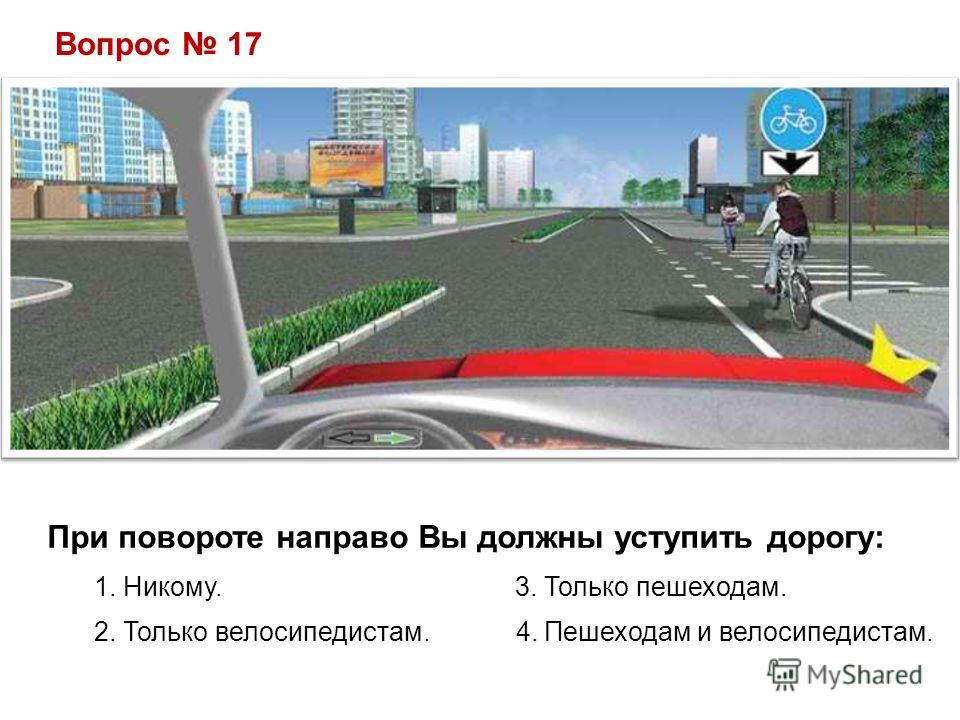 Вопрос 17 При повороте направо Вы должны уступить дорогу: 1. Никому. 3. Только пешеходам. 2. Только велосипедистам. 4. Пешеходам и велосипедистам.