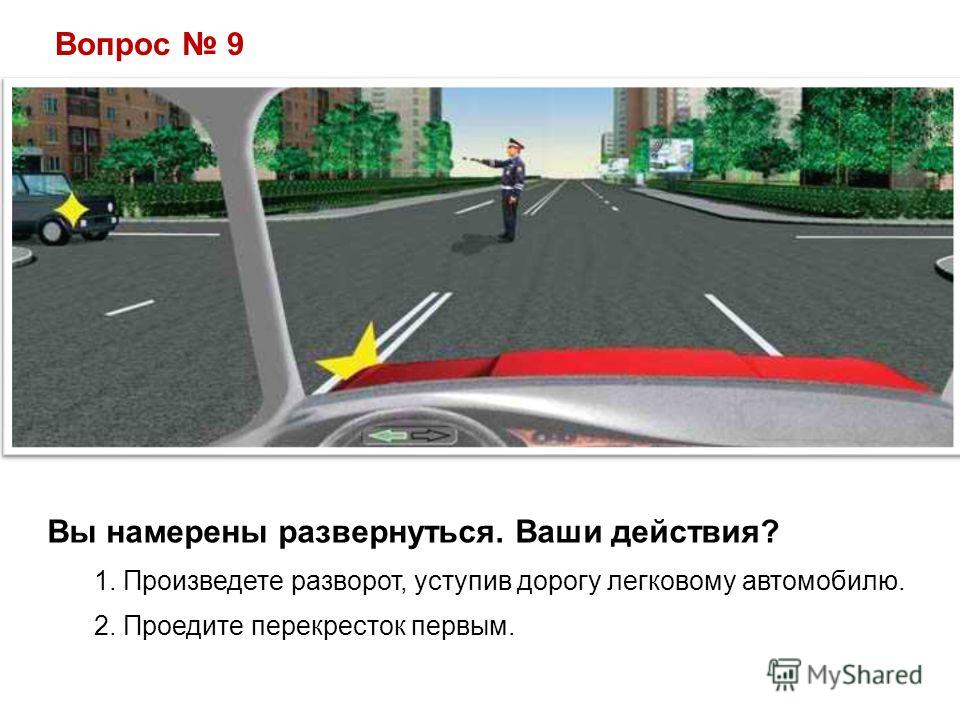 Вопрос 9 Вы намерены развернуться. Ваши действия? 1. Произведете разворот, уступив дорогу легковому автомобилю. 2. Проедите перекресток первым.
