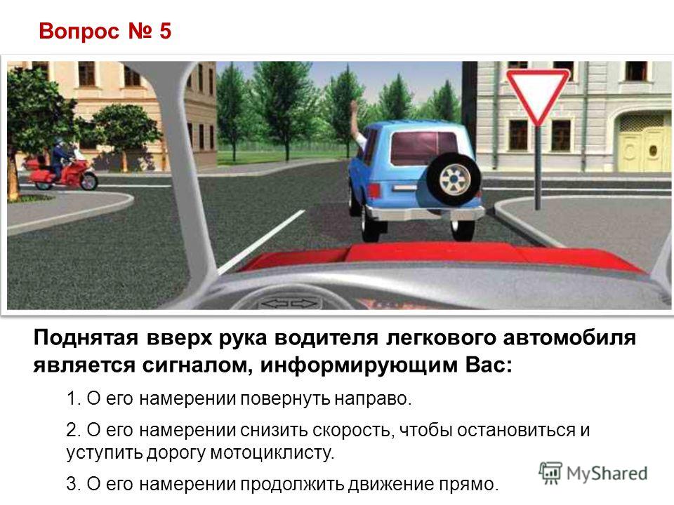 Вопрос 5 Поднятая вверх рука водителя легкового автомобиля является сигналом, информирующим Вас: 1. О его намерении повернуть направо. 2. О его намерении снизить скорость, чтобы остановиться и уступить дорогу мотоциклисту. 3. О его намерении продолжить движение прямо.