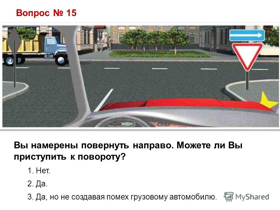 Вопрос 15 Вы намерены повернуть направо. Можете ли Вы приступить к повороту? 1. Нет. 2. Да. 3. Да, но не создавая помех грузовому автомобилю.