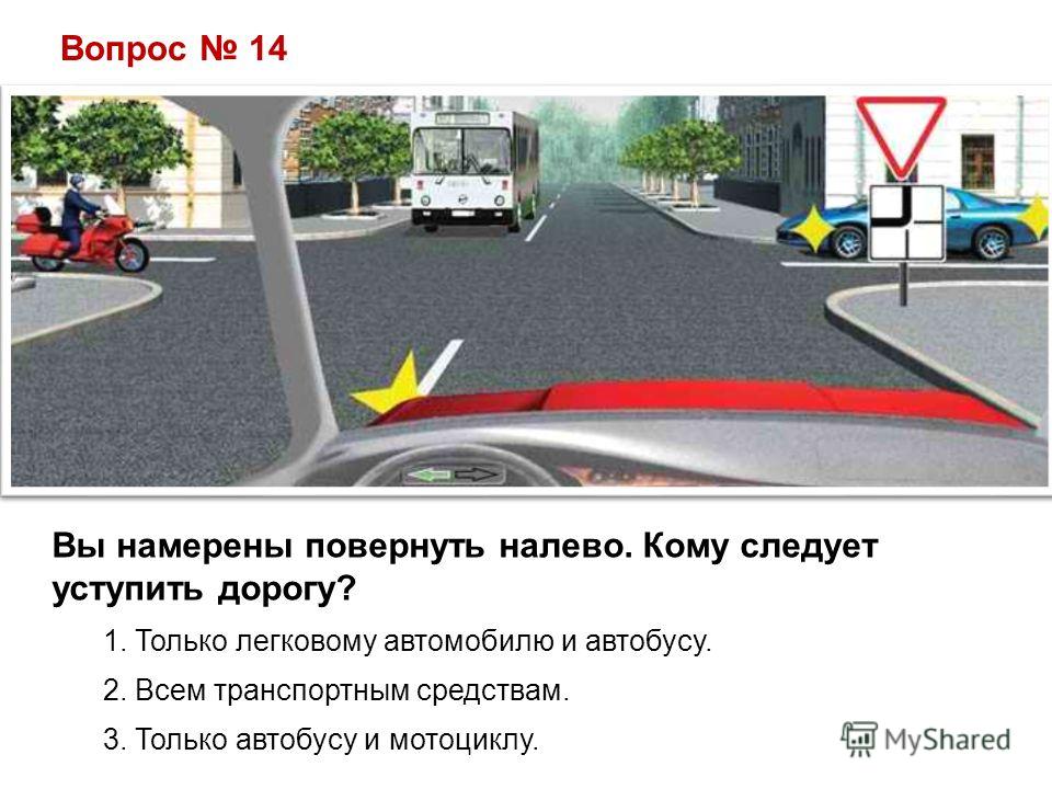 Вопрос 14 Вы намерены повернуть налево. Кому следует уступить дорогу? 1. Только легковому автомобилю и автобусу. 2. Всем транспортным средствам. 3. Только автобусу и мотоциклу.