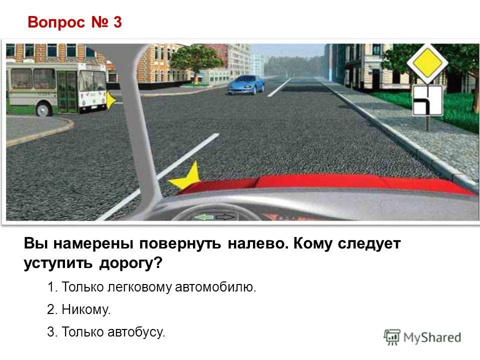Вопрос 3 Вы намерены повернуть налево. Кому следует уступить дорогу? 1. Только легковому автомобилю. 2. Никому. 3. Только автобусу.