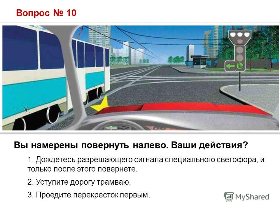 Вопрос 10 Вы намерены повернуть налево. Ваши действия? 1. Дождетесь разрешающего сигнала специального светофора, и только после этого повернете. 2. Уступите дорогу трамваю. 3. Проедите перекресток первым.