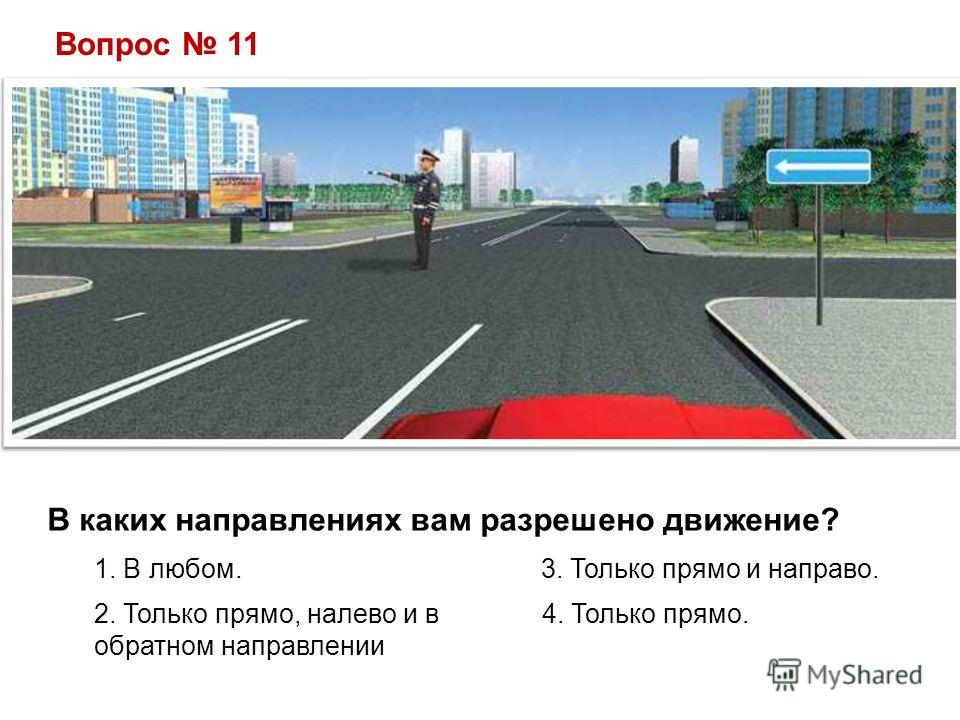 Вопрос 11 В каких направлениях вам разрешено движение? 1. В любом. 3. Только прямо и направо. 2. Только прямо, налево и в 4. Только прямо. обратном направлении