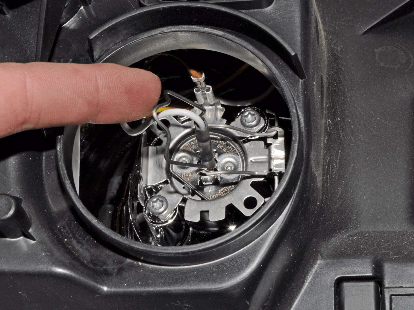 5. Извлеките лампу из контактной колодки. 6. Вставьте новую лампу в отражате до фиксации пружинными держателями и присоедините к ней колодку жгута проводов.