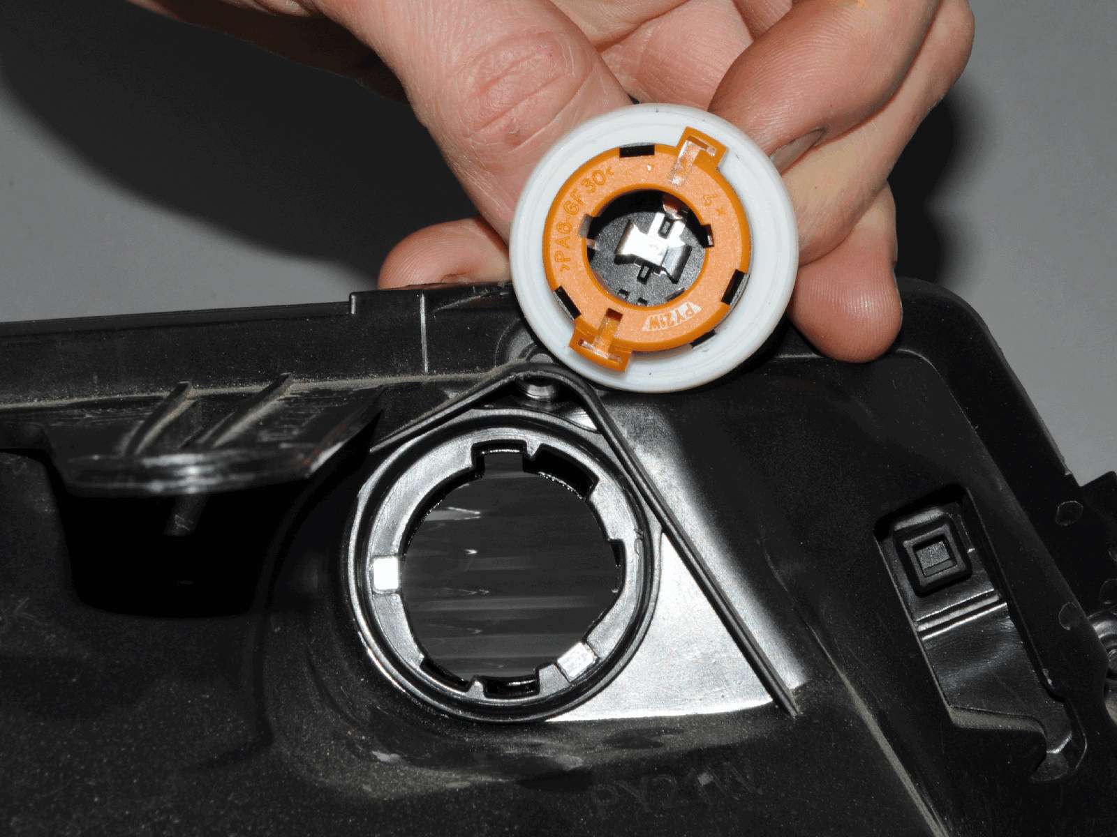 - Для снятия лампочки необходимо надавить на штекер пальцем, преодолевая сопротивление 3 пружинных зажимов. После снятия фиксаторов раздастся щелчок, лампа станет свободно перемещаться в посадочном окне.