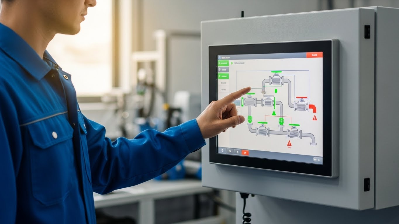 - Панель оператора (HMI). Сенсорный экран для взаимодействия. Не для красоты, а для отображения мнемосхемы процесса, ввода уставок (например, требуемой температуры), ручного управления в нештатной ситуации и сигнализации об авариях.